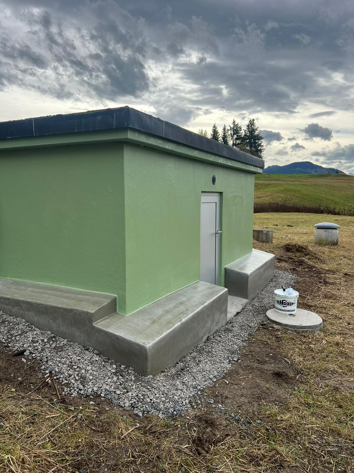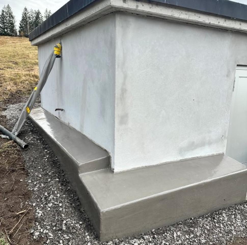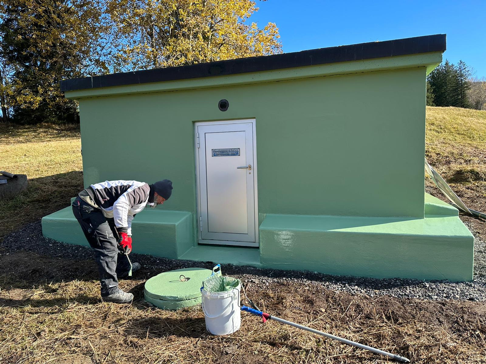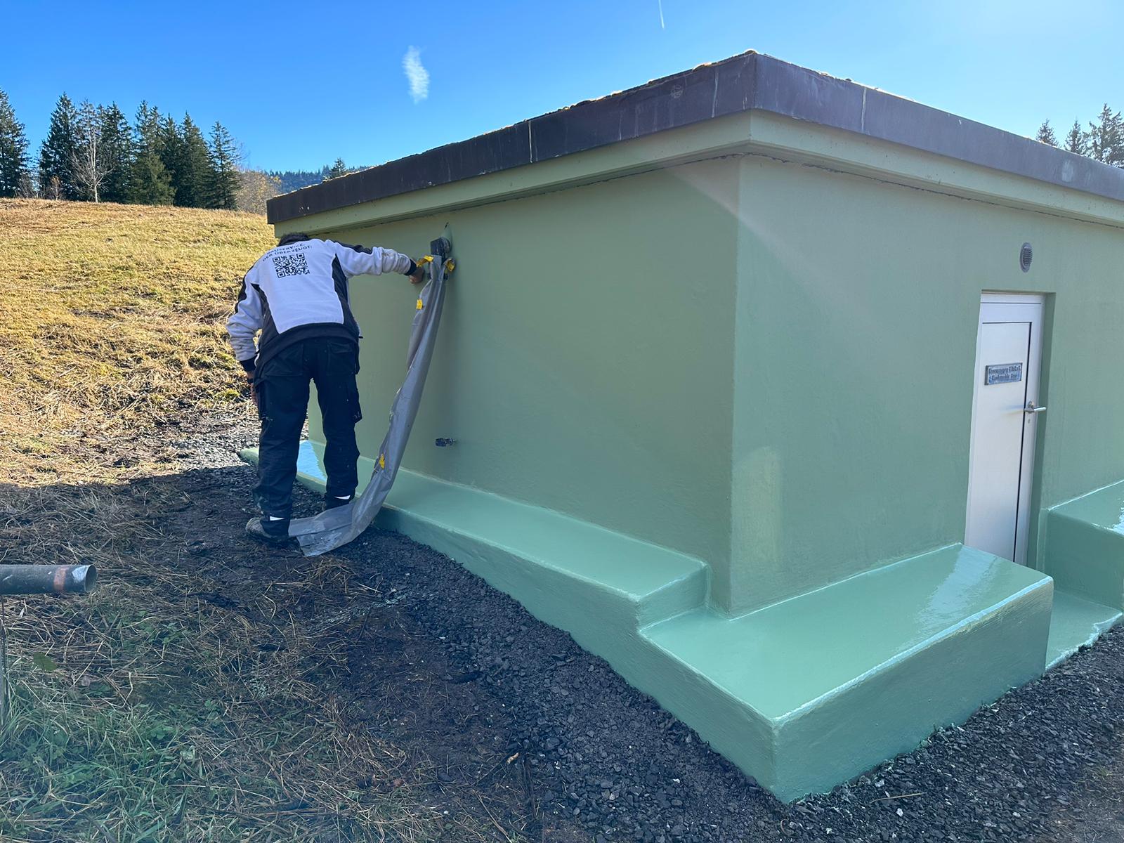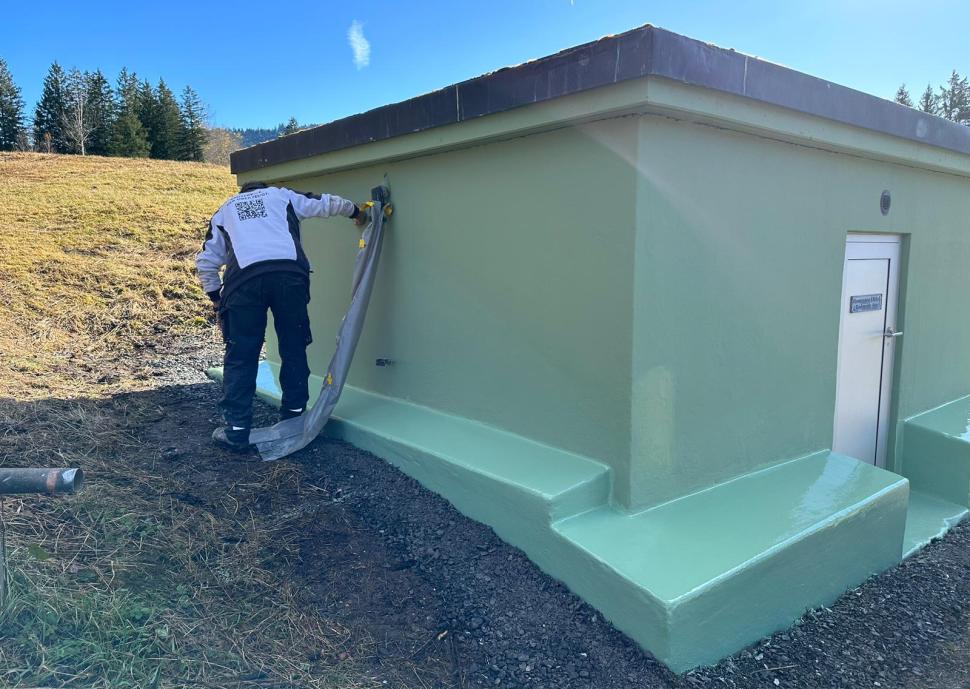 Die in einem geschützten Moorgebiet liegende Brunnenstube der Wasserversorgung HTRK in Rüschlikon wurde im Zuge von Instandsetzungsarbeiten umfassend abgedichtet und an der Fassade instand gesetzt. Ziel der Massnahme war es, die bestehende Betonkonstruktion dauerhaft abzudichten und die Fassade instand zu setzen. Zunächst wurde der bestehende, teilweise mürbe Verputz vollständig entfernt, um die Betonkonstruktion freizulegen. Anschliessend wurde der gesamte Untergrund angeschliffen und geschädigte Bereiche im Rahmen einer Betonsanierung instand gesetzt. Risse, Fugen und Anschlüsse wurden mit abgesandeten Combiflexbändern dauerhaft abgedichtet. Darauf folgte das Aufbringen eines Sperrputzes, der die Konstruktion zusätzlich vor Feuchtigkeit schützt. Den Abschluss bildete der Fassadenanstrich in grüner Farbgebung.