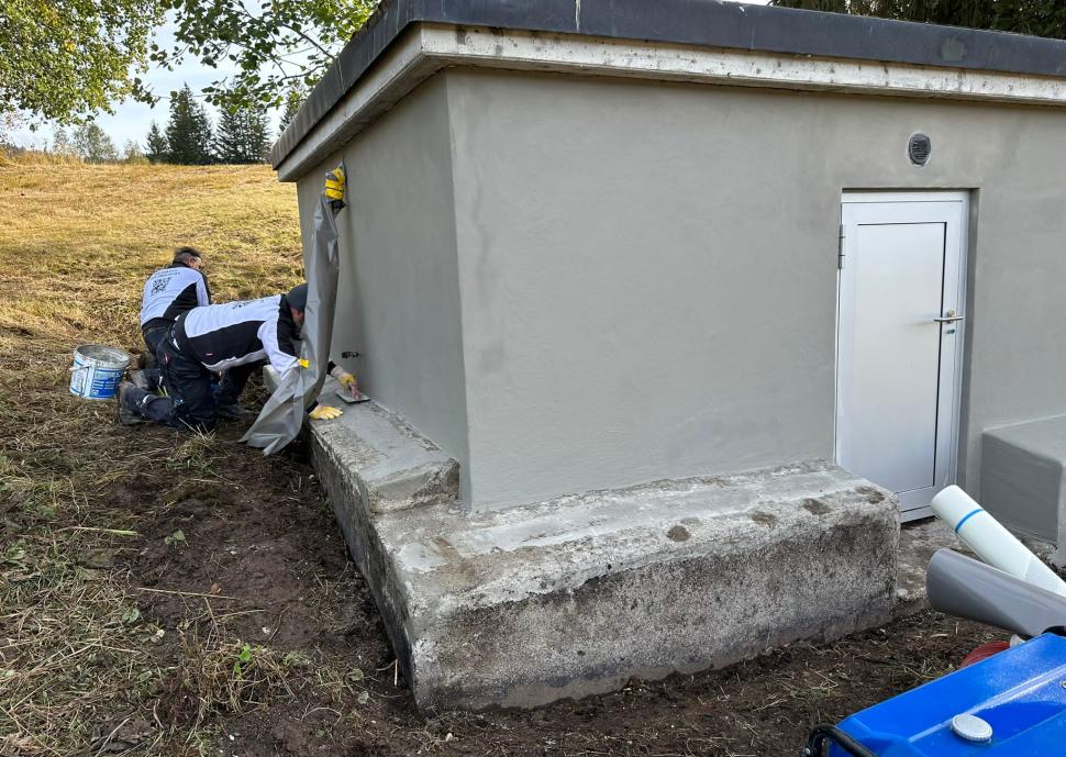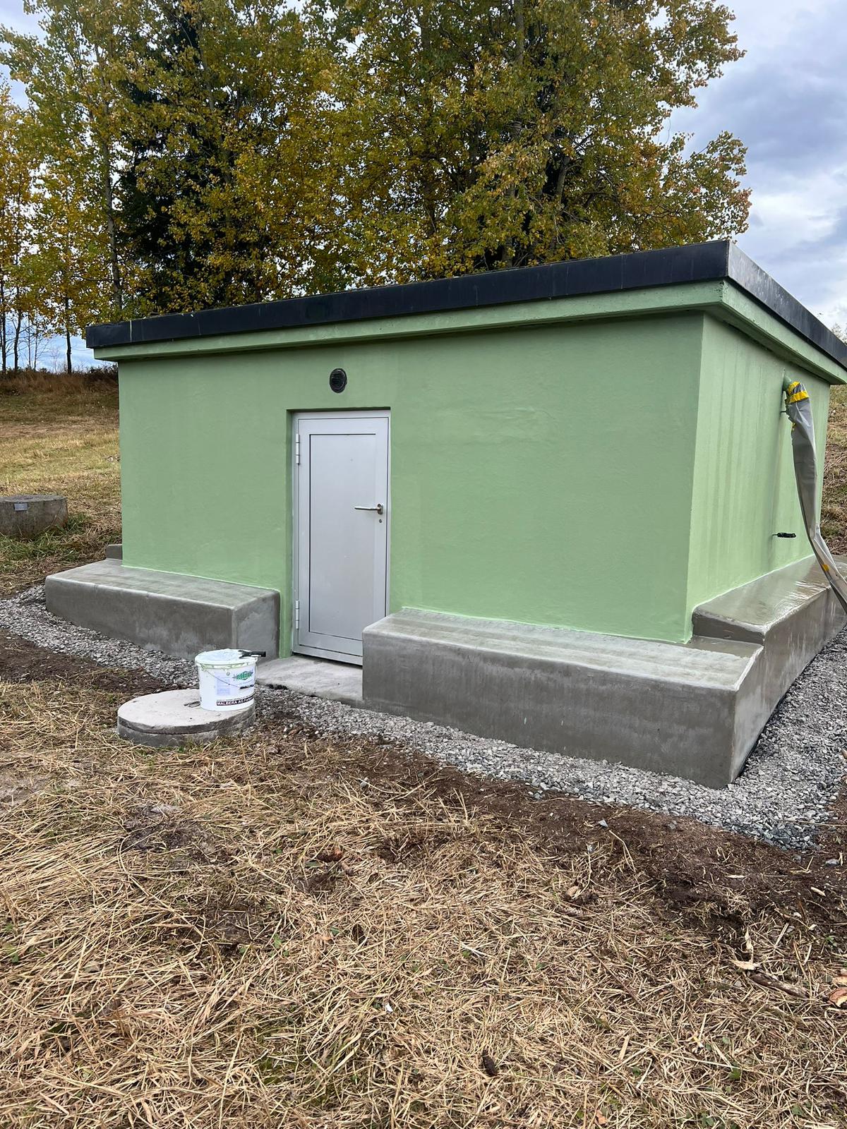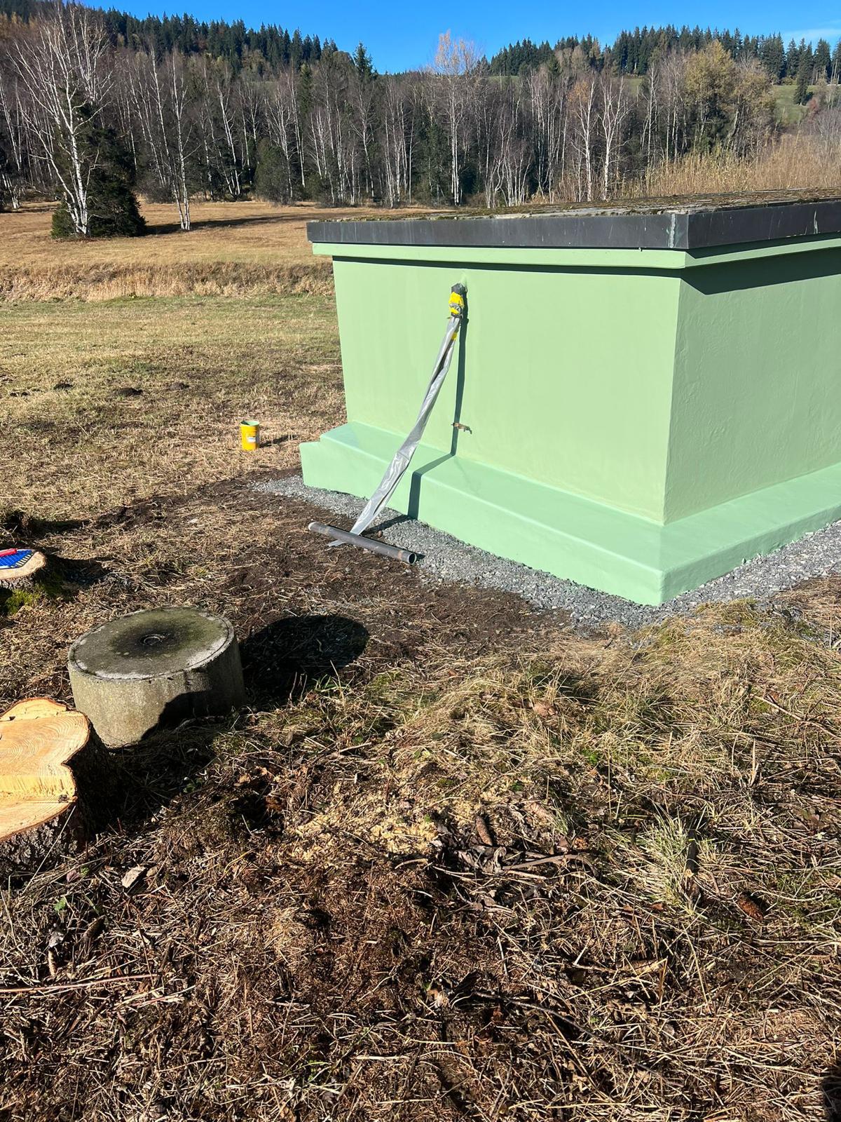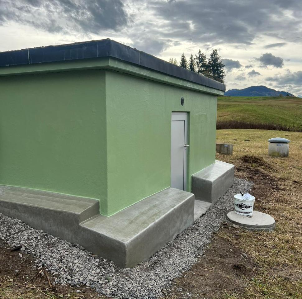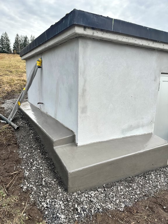 Die in einem geschützten Moorgebiet liegende Brunnenstube der Wasserversorgung HTRK in Rüschlikon wurde im Zuge von Instandsetzungsarbeiten umfassend abgedichtet und an der Fassade instand gesetzt. Ziel der Massnahme war es, die bestehende Betonkonstruktion dauerhaft abzudichten und die Fassade instand zu setzen. Zunächst wurde der bestehende, teilweise mürbe Verputz vollständig entfernt, um die Betonkonstruktion freizulegen. Anschliessend wurde der gesamte Untergrund angeschliffen und geschädigte Bereiche im Rahmen einer Betonsanierung instand gesetzt. Risse, Fugen und Anschlüsse wurden mit abgesandeten Combiflexbändern dauerhaft abgedichtet. Darauf folgte das Aufbringen eines Sperrputzes, der die Konstruktion zusätzlich vor Feuchtigkeit schützt. Den Abschluss bildete der Fassadenanstrich in grüner Farbgebung.